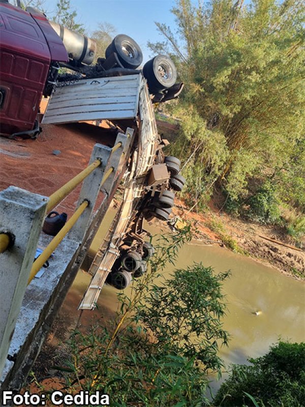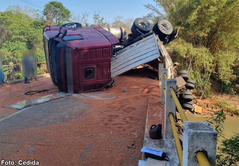 Segundo informações, por motivos a serem apurados, o caminhão trator da carreta tombou sobre a ponte ficando sobre a pista, e o semirreboque caiu sobre a ponte, ficando suspenso nas laterais. O veículo estava carregado com sorgo e parte da carga caiu sobre a via.
