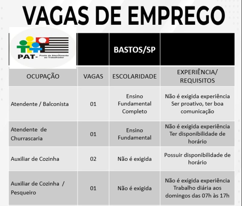 Maiores informações podem ser obtidas no Posto de Atendimento ao Trabalhador de Bastos, que atende na sala 4 do Poupatempo de Bastos, na Rua Campos Sales, 178, centro, ou pelos telefones (14) 99610-9766 e (14) 99745-3532. O interessado deve procurar à unidade de emprego munido de RG, CPF, Carteira de Trabalho e currículo atualizado.