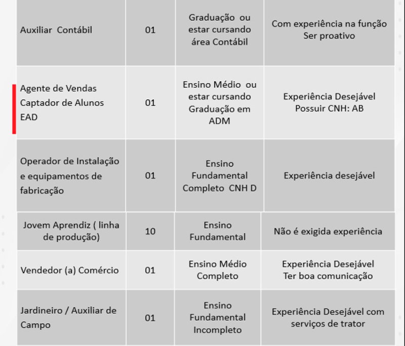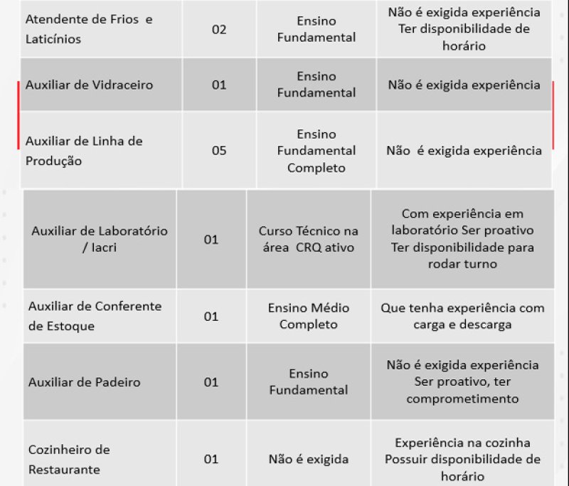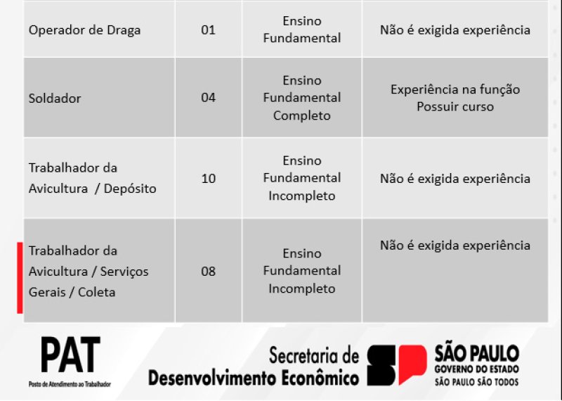Das vagas disponíveis, 1 de atendente (balconista), 1 de atendente de churrascaria, 1 de auxiliar de cozinha (pesqueiro), 2 de atendente de frios e laticínios, 1 de auxiliar de vidraceiro, 5 de auxiliar de linha de produção, 1 de auxiliar de padeiro, 10 de jovem aprendiz (linha de produção), 1 de operador de draga, 10 de trabalhador da avicultura (depósito) e 8 de trabalhador da avicultura (serviços gerais e coleta), não exigem experiência do candidato.