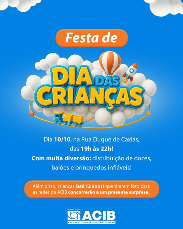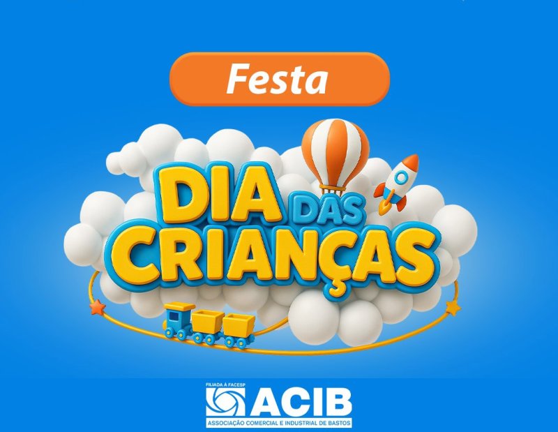 A Associação Comercial e Industrial de Bastos - ACIB promove nesta sexta-feira, dia 10, uma festa imperdível e com muita diversão em comemoração ao Dia das Crianças, que será celebrado domingo (12). O evento, que terá brinquedos infláveis para as crianças se divertirem a vontade e distribuição de doces e balões, acontecerá na Rua Duque de Caxias, centro da cidade.