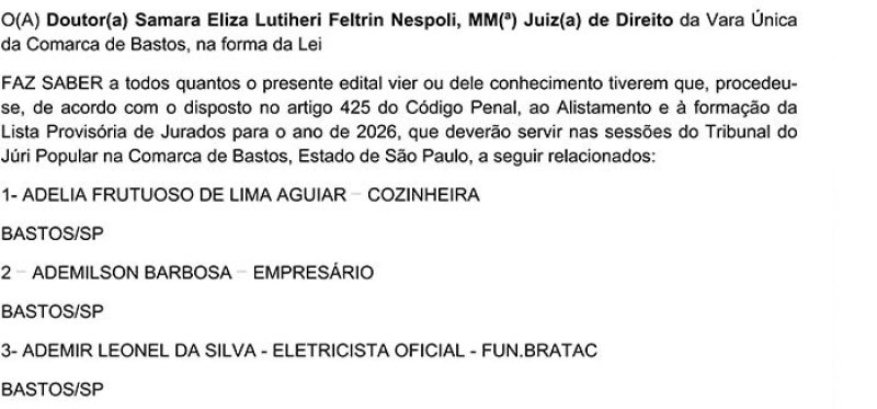 Edital de Alistamento Provisório de Jurados – Vara Única da Comarca de Bastos - SP