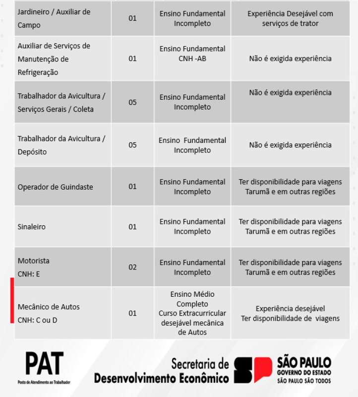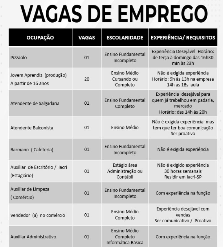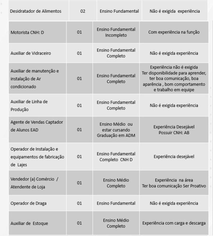 Das vagas disponíveis, 39 de jovem aprendiz (produção, a partir de 16 anos), 1 de atendente balconista, 1 de barman (cafeteria), 1 de auxiliar de escritório (estagiário, residir em Iacri), 2 de desidratador de alimentos, 1 de auxiliar de vidraceiro, 1 de auxiliar de linha de produção, 1 de operador de draga, 1 de auxiliar de serviços de manutenção de refrigeração, 5 de trabalhador da avicultura (serviços gerais e coleta) e 5 de trabalhador da avicultura (depósito), e não exigem experiência do candidato.