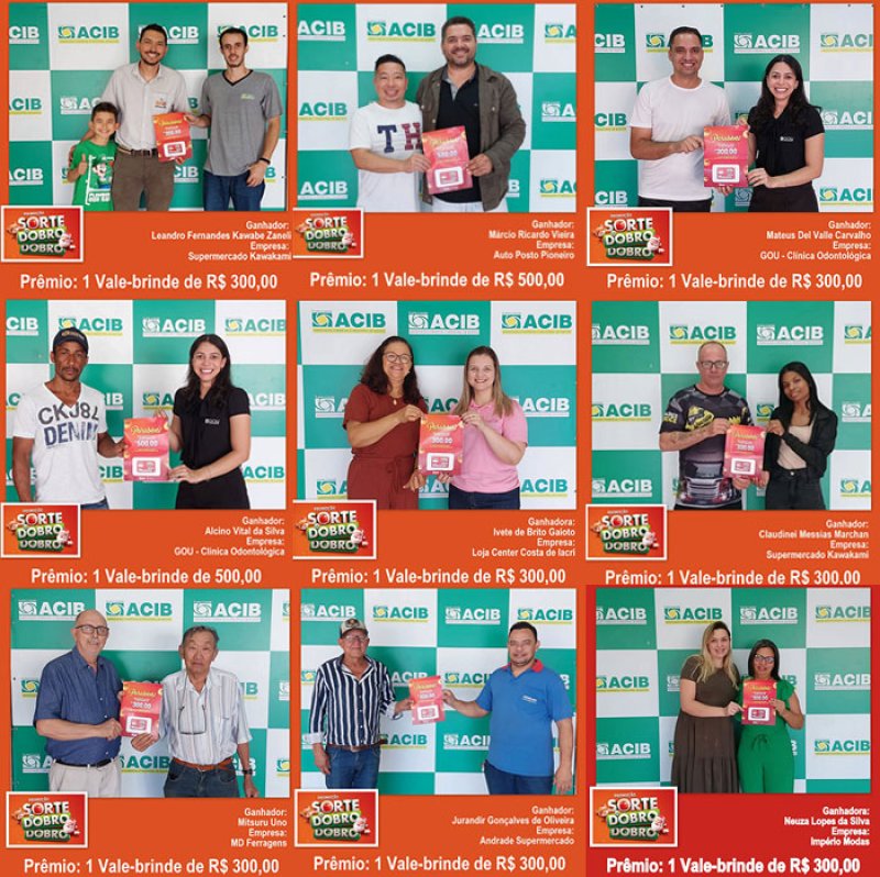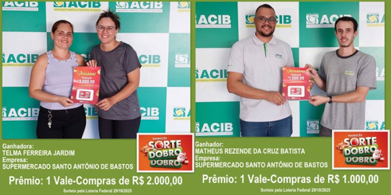 Foi realizada nesta semana a entrega dos vales-compras da primeira fase da Campanha SORTE EM DOBRO, promovida pela Associação Comercial e Industrial de Bastos (ACIB) em parceria com empresas associadas. Os prêmios, referentes ao sorteio do Dia das Crianças foi feito através da Loteria Federal no último dia 29, contemplaram dois consumidores com vales-compras de R$ 2.000,00 e R$ 1.000,00. Para concorrer aos demais prêmios, pagos com cartão de premiação magnético para ser utilizado em qualquer uma das empresas participantes, o consumidor precisa comprar ou adquirindo serviços nas empresas participantes da campanha.
