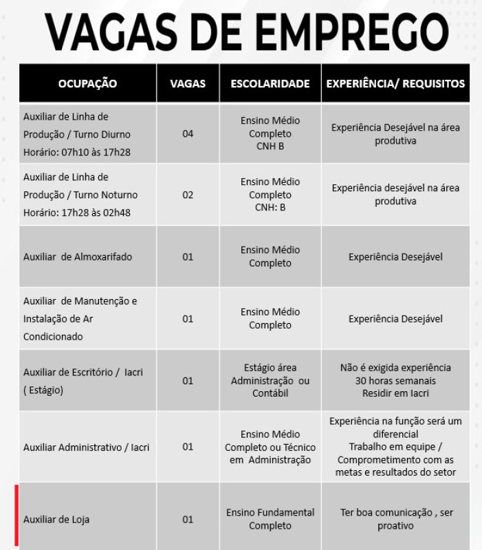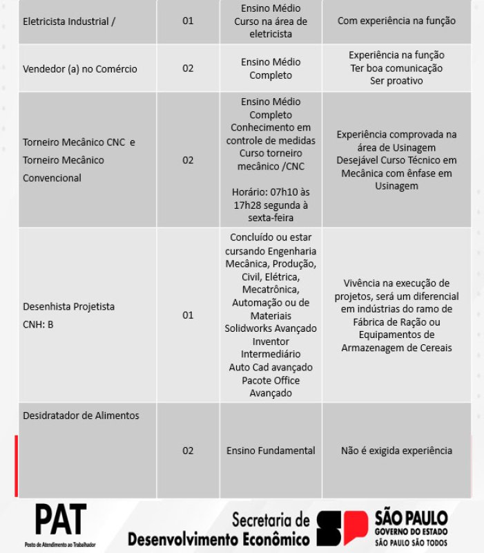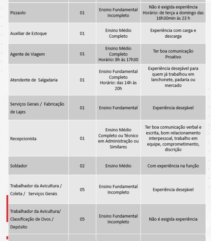 Das vagas disponíveis, 1 de auxiliar de escritório (estágio, residir em Iacri), 1 de auxiliar de loja (ter boa comunicação e ser proativo), 1 de pizzaiolo, 1 de agente de viagem (ter boa comunicação e ser proativo), 1 de recepcionista (ter boa comunicação verbal e escrita, bom relacionamento interpessoal, trabalho em equipe, comprometimento, discrição), 5 de trabalhador da avicultura (classificação de ovos) e 2 de desidratador de alimentos, não exigem experiência do candidato.