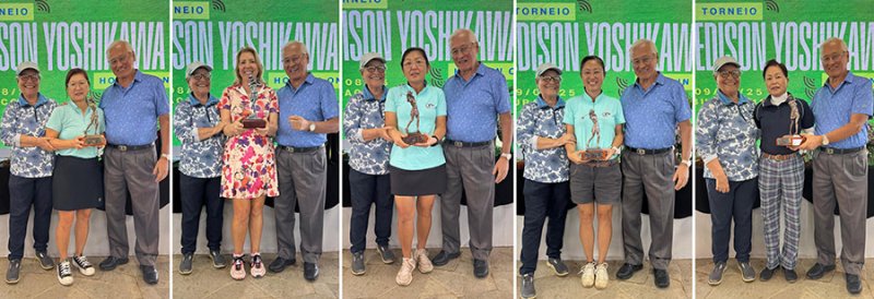 Aconteceu no último domingo, dia 15, no Bastos Golf Clube (BGC), o 3º Torneio Hole in One “Edison Yoshikawa”. O evento esportivo, que comemorou o terceiro hole in one - jogada em que o golfista acerta a bola no buraco com apenas uma tacada, feito exige habilidade e precisão – de Edison Yoshikawa, feito registrado em 9 de agosto deste ano, conferiu as taças de campeã scratch a Diogo Uemura, Valdir Dezan e Gabriela Yoshikawa (na foto acima ladeados pelo casal Dulce e Edison Yoshikawa).