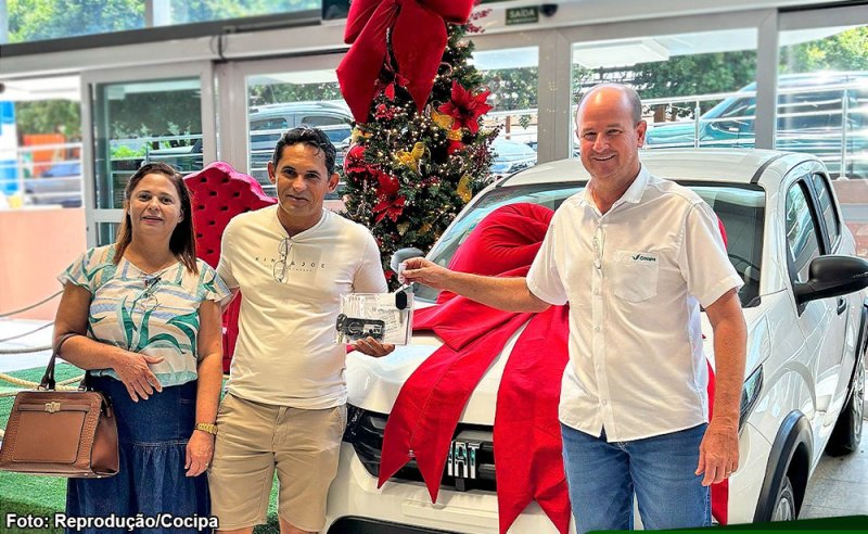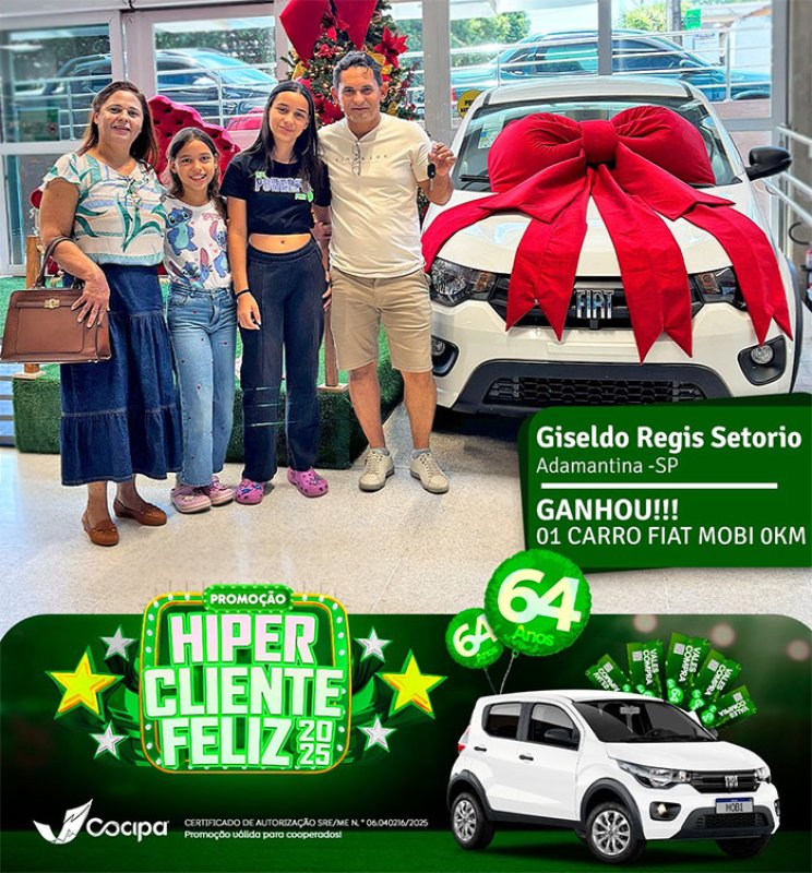 O caldeireiro Giseldo Regis Setorio, morador na Vila Industrial, em Adamantina, recebeu neste sábado (22) as chaves do automóvel Fiat Mobi zero quilômetro, conquistado no terceiro sorteio da Campanha Hiper Cliente Feliz, da Cocipa (Cooperativa de Consumo de Inúbia Paulista). O sorteio foi realizado no dia 8 de novembro, em Inúbia Paulista, em comemoração aos 64 anos da Cooperativa. A entrega das chaves foi feita pelo gerente comercial da Cocipa, Márcio Cavalaro.