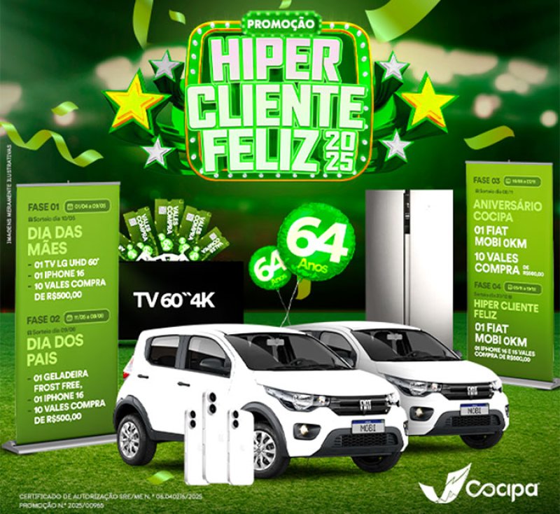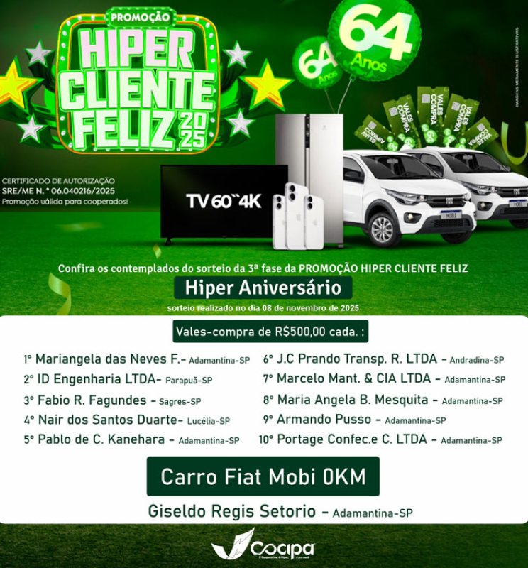Todos os sorteios ocorrem na loja Hiper Cocipa em Inúbia Paulista, sempre às 10h, abertos ao público e com transmissão ao vivo pelos seus canais de redes sociais. Acesse aqui o regulamento completo da campanha.