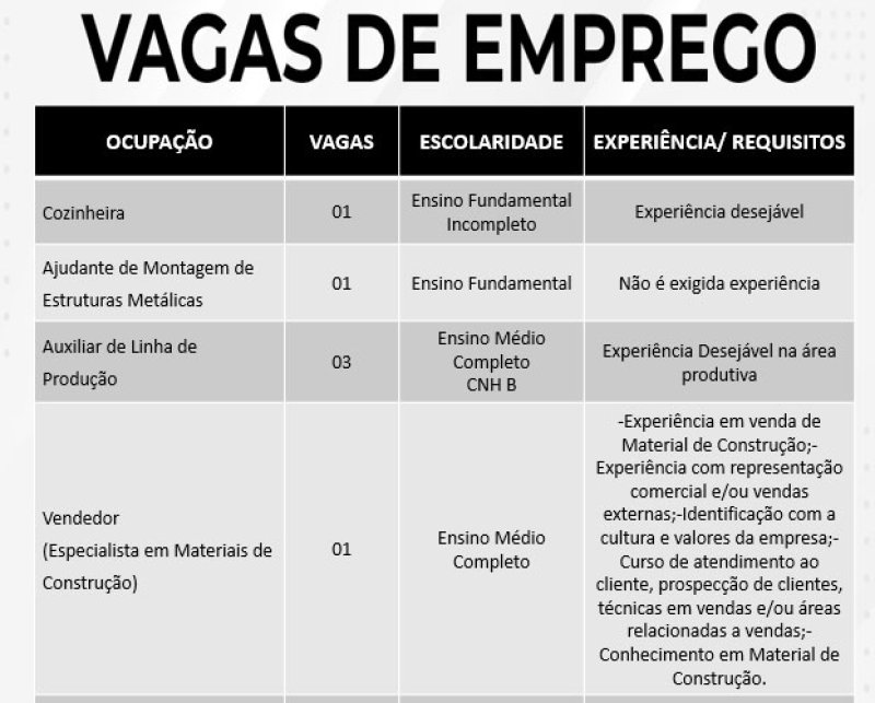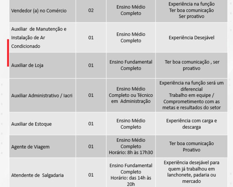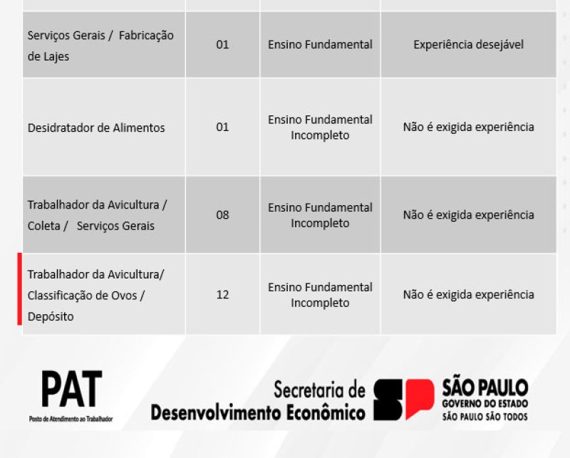 Das vagas disponíveis, 1 de ajudante de montagem de estruturas metálicas, 1 de auxiliar de loja (ter boa comunicação e ser proativo), 1 de agente de viagem (ter boa comunicação e ser proativo), 1 de desidratador de alimentos, 8 de trabalhador da avicultura (coleta e serviços gerais) e 12 de trabalhador da avicultura (classificação de ovos), não exigem experiência do candidato.
