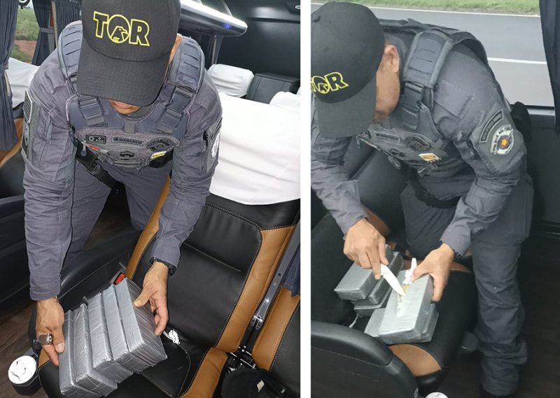 Ainda conforme a Polícia Rodoviária, durante vistoria do compartimento de passageiros dois homens de nacionalidade boliviana apresentaram grande nervosismo e respostas desconexas na entrevista e, diante dos fatos, foi vistoriado as poltronas onde os mesmos estavam sentados e localizados dentro dos assentos, entre as espumas e os forros, cinco tabletes de pasta base de COCAINA que, após pesados, totalizaram 5 quilos e 360 gramas.