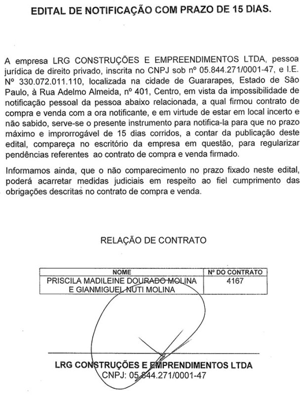 LRG Construções e Empreendimentos LTDA - Edital de notificação com prazo de 15 dias