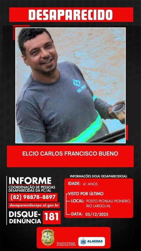 A ficha oficial de desaparecimento já foi divulgada pelo governo de Alagoas, com os seguintes dados: