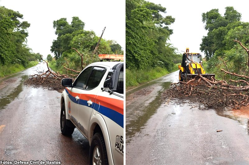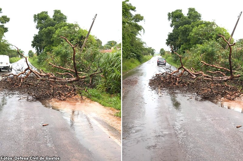 Segundo a Defesa Civil Municipal de Bastos, “em decorrência das fortes chuvas registradas no município a árvore de grande porte caiu sobre a estrada vicinal Bastos–Tupã e causou a interdição parcial da via, oferecendo risco à segurança dos motoristas que trafegavam pelo local”.