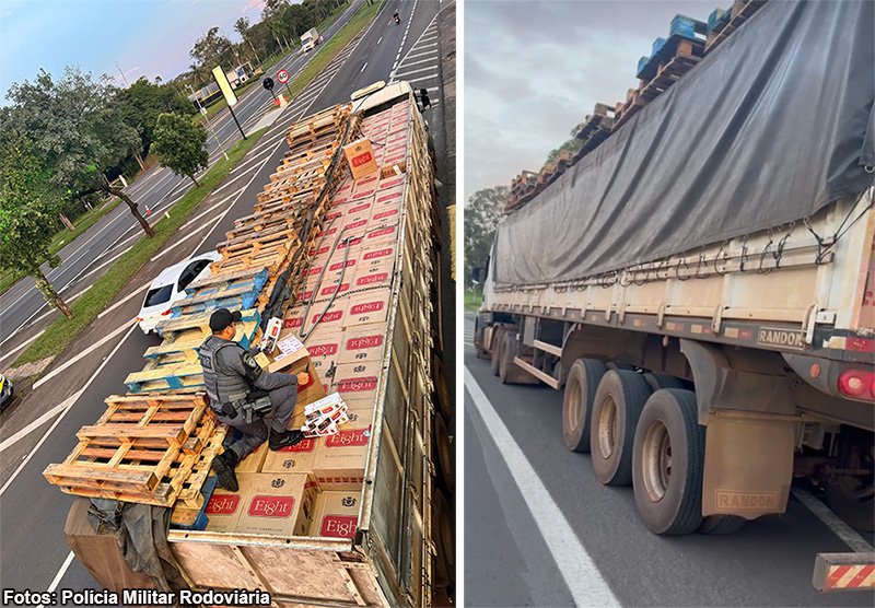 Segundo o registro, as equipes da 2ª Companhia da Polícia Militar Rodoviária abordaram um caminhão, da marca Scania T124, que tracionava semirreboque, ambos com placas de Dourados (MS), e na fiscalização ao compartimento de carga encontrou grande carregamento de cigarros de origem estrangeira, total de 350.000 maços avaliados em R$ 1.750.000,00.