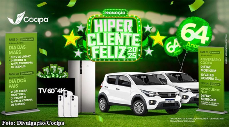 A Cocipa (Cooperativa de Consumo de Inúbia Paulista) fecha com chave de ouro a Campanha Hiper Cliente Feliz 2025. Neste sábado, dia 20, acontece a última extração da atual edição da campanha com sorteio de um automóvel Fiat Mobi 0km (no valor de R$ 65.000,00), 15 vales-compras no valor de R$ 500 cada e um celular iPhone 16 128GB. A extração acontece a partir das 10 horas na Hiper Cocipa, em Inúbia Paulista (SP). Todos os cupons emitidos desde o início da campanha participam deste último sorteio.