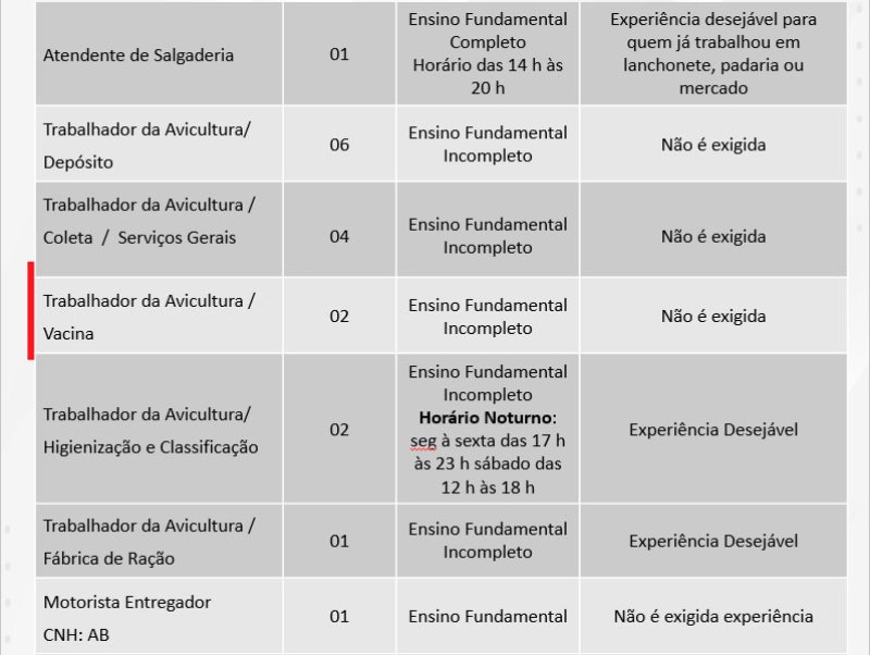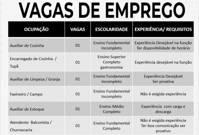 Das vagas disponíveis, 1 de faxineiro (campo), 1 de atendente balconista de churrascaria (ter boa comunicação), 6 de trabalhador da avicultura (depósito), 4 de trabalhador da avicultura (coleta e serviços gerais), 2 de trabalhador da avicultura (vacina), 1 de motorista entregador (CNH: AB), 1 de ajudante de montagem (estruturas metálicas) e 1 de operador de draga (CNH:AB/não ter medo de altura), não exigem experiência do candidato.