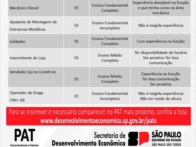 O PAT informa que o número de vagas pode alterar-se a qualquer momento (conforme a procura, as vagas são preenchidas) e algumas ofertas podem ficar indisponíveis de uma hora para outra. O PAT atende de segunda a sexta-feira, menos em feriado e ponto facultativo, das 9 às 17 horas (veja o endereço no final do texto).