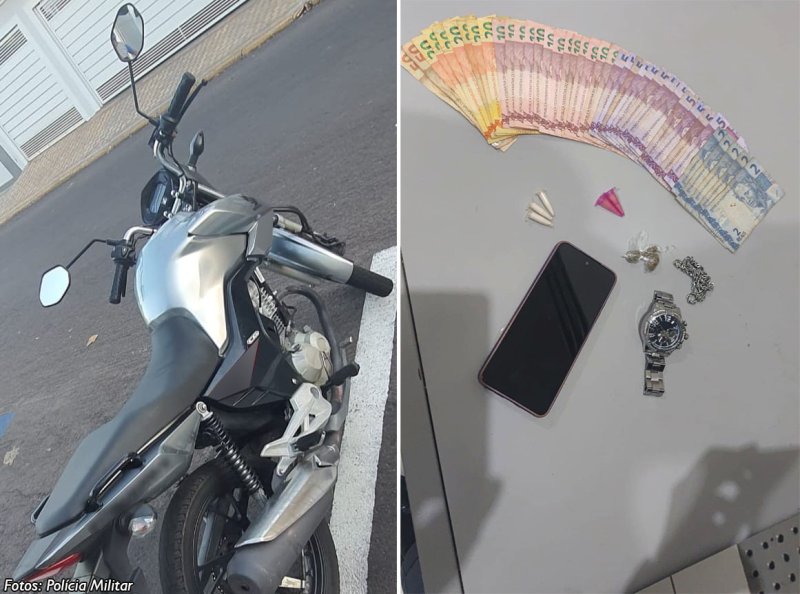 Os PMs informaram que no bolso dianteiro da bermuda do condutor foram encontrados três porções aparentando ser maconha e R$ 445,00 em notas fracionadas, além de um aparelho celular, e próximo ao local localizaram uma sacola plástica com três pinos de substância esbranquiçada semelhante a cocaína e dois pinos na coloração rosa aparentando ser crack.