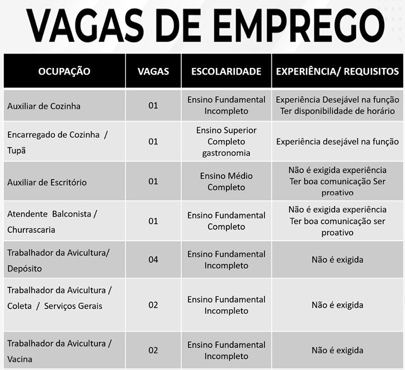 Das vagas disponíveis, 1 de auxiliar de escritório (ter boa comunicação/ser proativo), 1 de atendente balconista de churrascaria (ter boa comunicação), 4 de trabalhador da avicultura (depósito), 2 de trabalhador da avicultura (coleta e serviços gerais), 2 de trabalhador da avicultura (vacina), 1 de motorista entregador (CNH: AB), 1 de ajudante de montagem (estruturas metálicas) e 1 de operador de draga (CNH:AB/não ter medo de altura), não exigem experiência do candidato.
