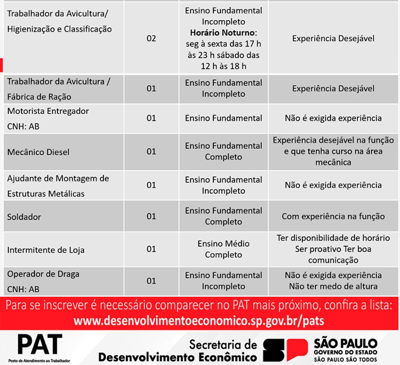 O PAT informa que o número de vagas pode alterar-se a qualquer momento (conforme a procura, as vagas são preenchidas) e algumas ofertas podem ficar indisponíveis de uma hora para outra. O PAT atende de segunda a sexta-feira, menos em feriado e ponto facultativo, das 9 às 17 horas (veja o endereço no final do texto).