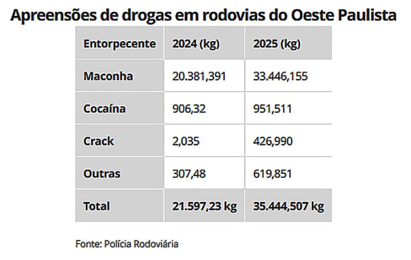 A quantidade de apreensões de drogas nas rodovias do Oeste Paulista, uma malha que soma cerca de 1.500 km de extensão, aumentou cerca de 64% em 2025, na comparação com o mesmo período de 2024. Entre janeiro e novembro, o volume total passou de 21.597,23 kg para 35.444,507 kg, segundo dados da Polícia Militar Rodoviária.