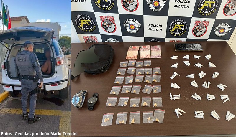 Ainda de acordo com a PM, a equipe se dividiu e fez um cerco nas imediações e deteve o indivíduo em fuga, que confessou estar comercializando entorpecentes no local, e apreendeu no interior do imóvel, mais precisamente sobre o sofá, 72 pinos de cocaína, 29 invólucros do tipo zip lock contendo crack, a quantia de R$ 29,00 em dinheiro, dois relógios e documentos pessoais.