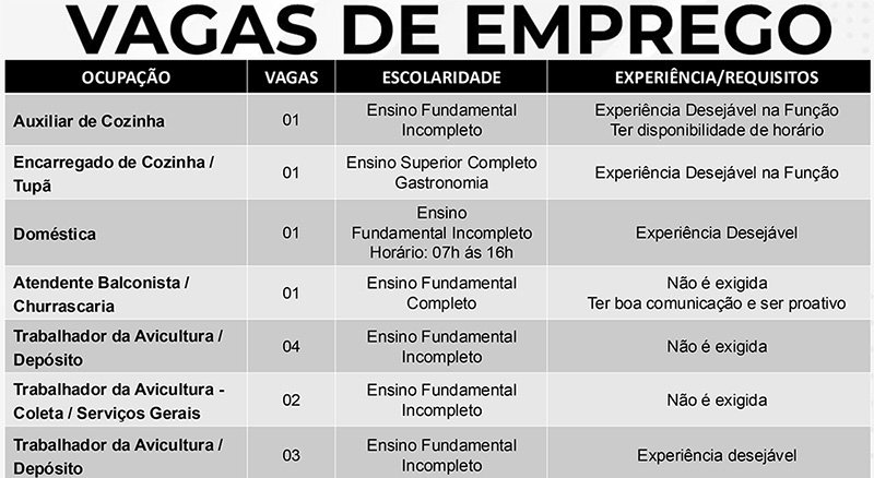 Das vagas disponíveis, 1 de atendente balconista / churrascaria (ter boa comunicação e ser proativo), 4 de trabalhador da avicultura (depósito), 2 de trabalhador da avicultura (coleta/serviços gerais), 2 de trabalhador da avicultura (vacina), 1 de motorista entregador (CNH AB), 1 de ajudante de montagem de estruturas metálicas e 1 de operador de draga, não exigem experiência do candidato.