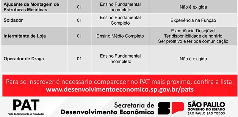 Maiores informações podem ser obtidas no Posto de Atendimento ao Trabalhador de Bastos, que atende na sala 4 do Poupatempo de Bastos, na Rua Campos Sales, 178, centro, ou pelos telefones (14) 99610-9766 e (14) 99745-3532. O interessado deve procurar à unidade de emprego munido de RG, CPF, Carteira de Trabalho e currículo atualizado.