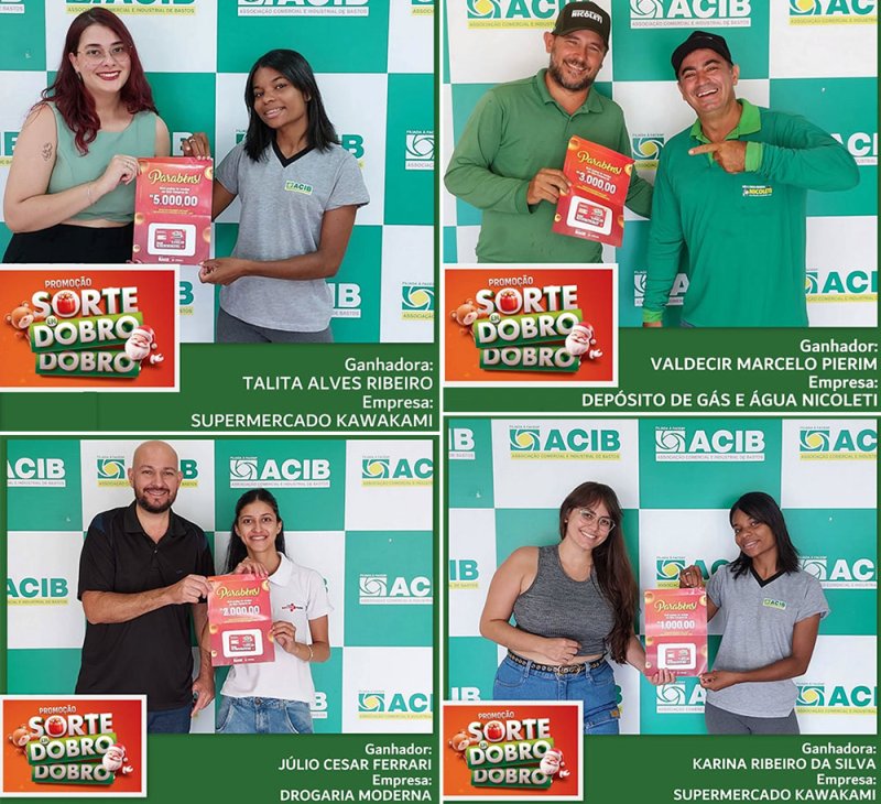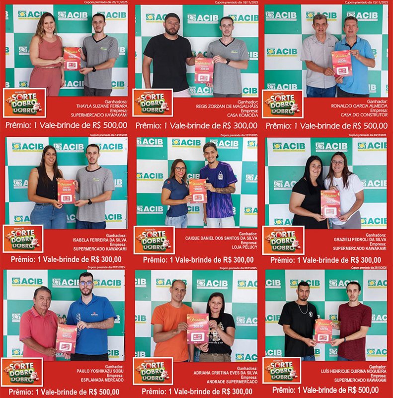 No total a Campanha SORTE EM DOBRO 2025 distribuiu R$ 30.000,00 em prêmios, sendo R$ 16.000,00 em vales brindes (prêmios instantâneos) e R$ 14.000,00 em vales-compras através de sorteios através da Loteria Federal. Concorreram aos prêmios instantâneos e participaram dos sorteios dos vales-compras os consumidores que compraram ou adquiriram serviços em uma das empresas participantes, receberam cupons e cadastraram no site da promoção (promocaoacib.com.br).