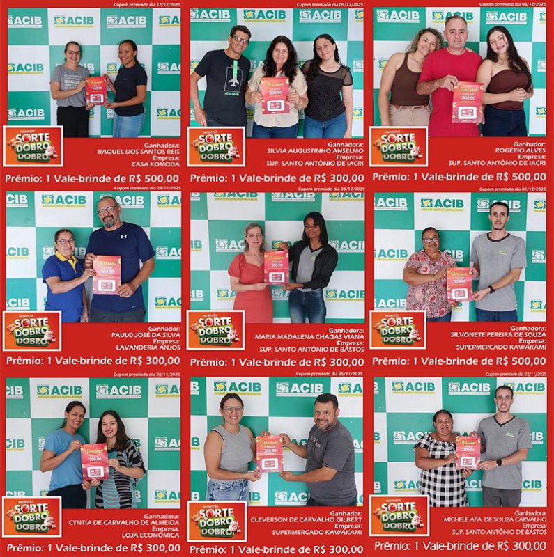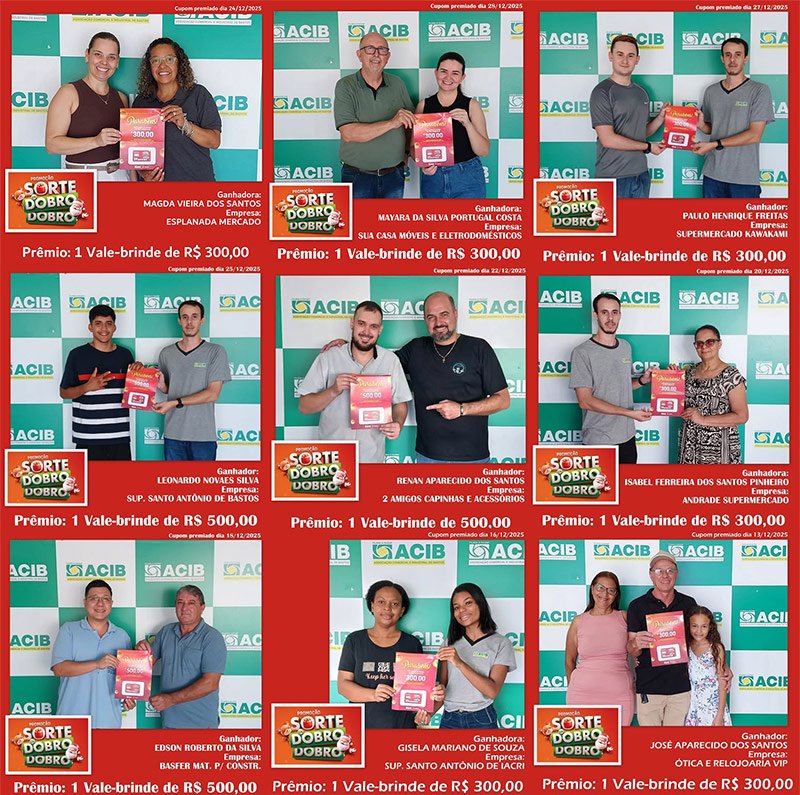 Foi realizada nesta semana a cerimônia de entrega dos prêmios aos ganhadores da última fase da Campanha SORTE EM DOBRO 2025. Promovida pela Associação Comercial e Industrial de Bastos (ACIB) em parceria com empresas associadas, a campanha foi alusiva ao Dia das Crianças e Natal de 2025 e distribuiu R$ 30.000,00 em prêmios, através de 44 prêmios instantâneos (vales-brindes) e seis valiosos vales-compras (sorteados através da Loteria Federal). Participaram dos sorteios os consumidores que compraram ou adquiriram serviços nas empresas participantes.