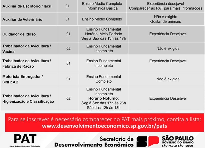 Das vagas disponíveis, 1 de atendente balconista / churrascaria (ter boa comunicação e ser proativo), 6 de trabalhador da avicultura (depósito/coleta/serviços gerais), 1 de auxiliar de veterinário (gostar de animais), 2 de trabalhador da avicultura (vacina) e 1 de motorista entregador (CNH AB), não exigem experiência do candidato.