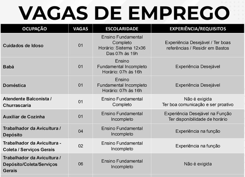 Maiores informações podem ser obtidas no Posto de Atendimento ao Trabalhador de Bastos, que atende na sala 4 do Poupatempo de Bastos, na Rua Campos Sales, 178, centro, ou pelos telefones (14) 99610-9766 e (14) 99745-3532. O interessado deve procurar à unidade de emprego munido de RG, CPF, Carteira de Trabalho e currículo atualizado.