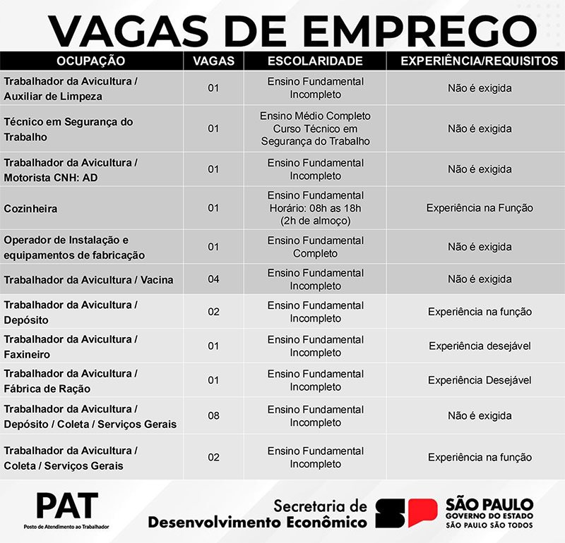 Das vagas disponíveis, 1 de trabalhador da avicultura (auxiliar de limpeza), 1 de técnico em segurança do trabalho, 1 de trabalhador da avicultura (motorista CNH:AD), 1 de operador de instalação e equipamentos de fabricação, 4 de trabalhador da avicultura (vacina) e 8 de trabalhador da avicultura (depósito/coleta/serviços gerais), não exigem experiência do candidato.