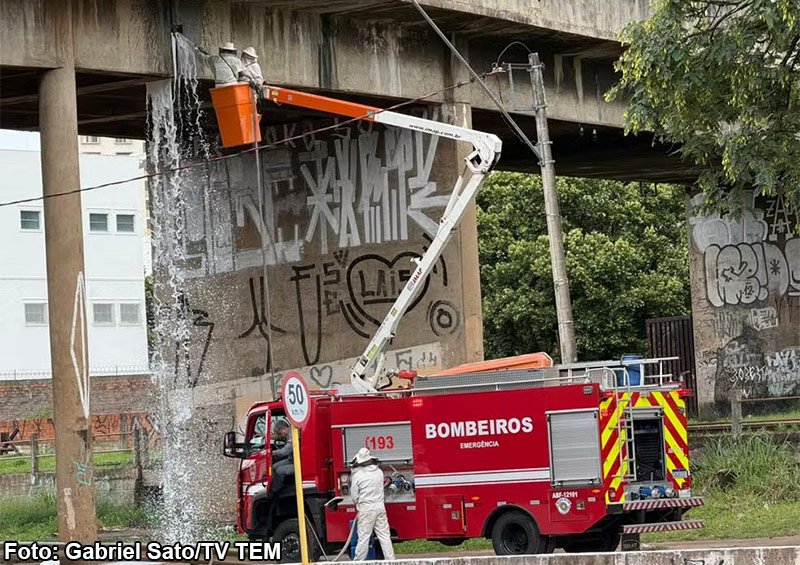 O Corpo de Bombeiros foi chamado para conter as abelhas. Um apicultor da região auxiliou na retirada do enxame, que estava alojado na parte inferior da estrutura do pontilhão.
