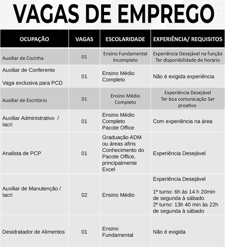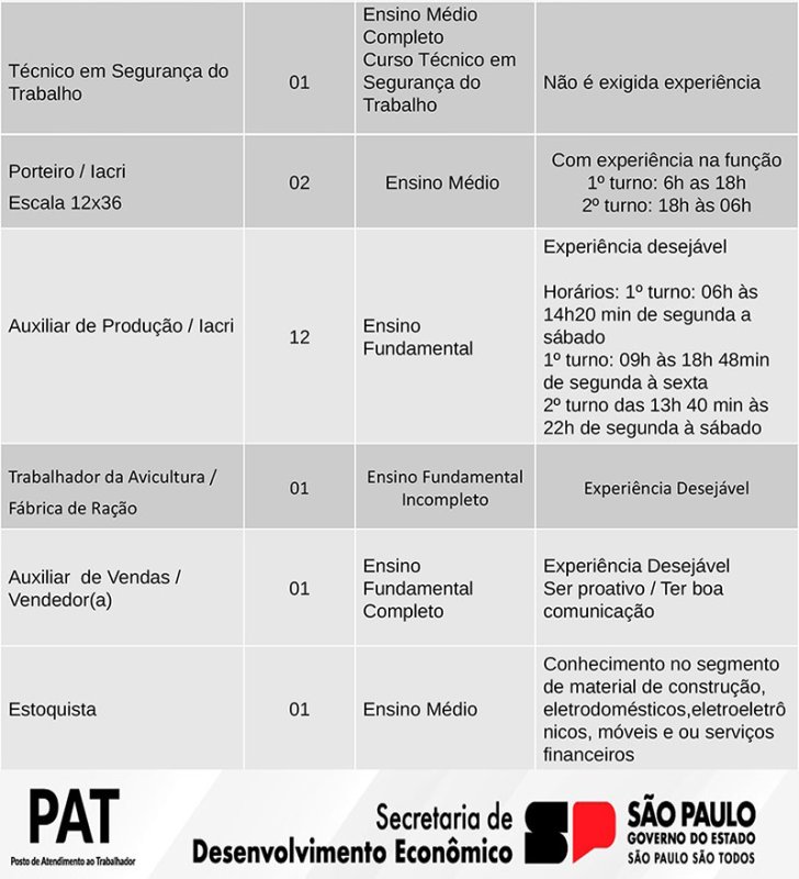 Das vagas disponíveis, 1 de auxiliar de Conferente (vaga exclusiva para PCD), 15 de auxiliar de produção (JAZAM Pompeia), 4 de ajudante de montagem de estruturas metálicas, 10 de trabalhador da avicultura (depósito), 5 de trabalhador da avicultura (coleta/serviços gerais), 1 de operador de instalação e equipamentos, 1 de técnico em segurança do trabalho e 1 desidratador de alimentos, não exigem experiência do candidato.