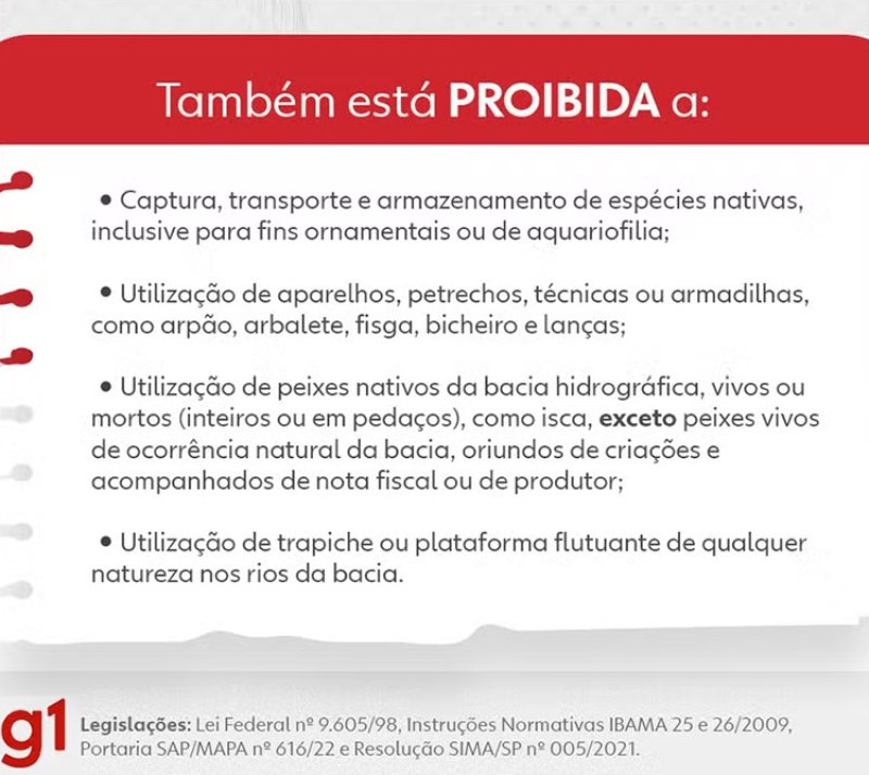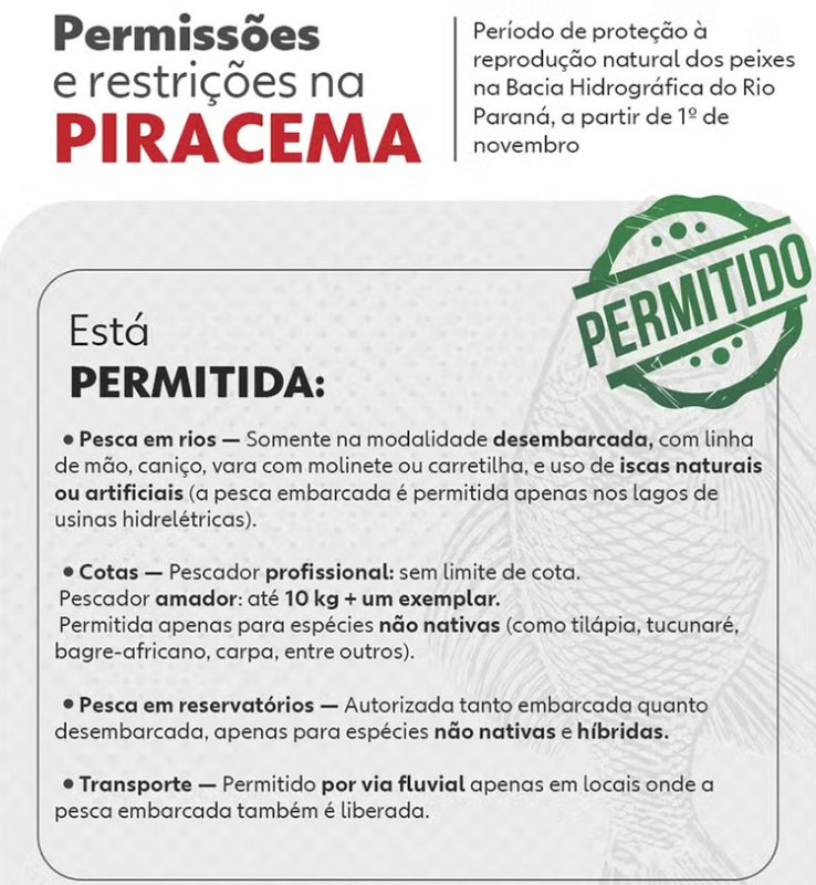 No período, é permitida apenas a pesca de subsistência, desembarcada. Fica proibido o transporte e a comercialização da pesca no período e só é permitida a venda de peixes com origem comprovada de aquicultura ou pesque-pague, licenciados.