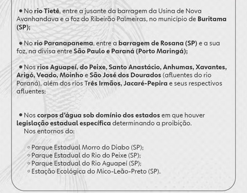 Está em vigor no Estado de São Paulo, desde 1º de novembro do ano passado, o período de defeso da piracema, quando a pesca fica temporariamente proibida até 28 de fevereiro de 2026. A medida, que busca garantir o ciclo natural de reprodução dos peixes e a conservação dos recursos pesqueiros, abrange praticamente todos os principais rios e afluentes das bacias do Rio Paraná e Atlântico Sudeste, como Tietê, Paraná, Paranapanema, Grande, Pardo, Mogi-Guaçu, Paraíba do Sul e Ribeira de Iguape.