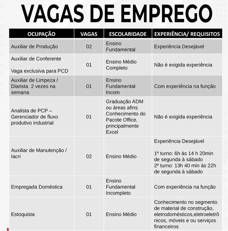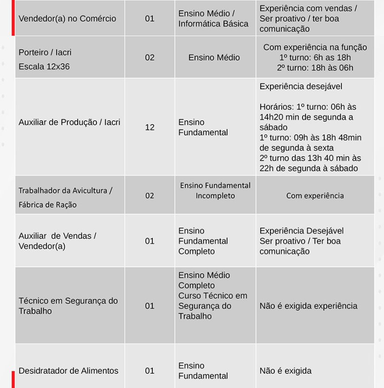 Das vagas disponíveis, 1 de auxiliar de conferente (vaga exclusiva para PCD), 1 de analista de PCP (gerenciador de fluxo produtivo industrial), 1 de técnico em segurança do trabalho, 1 de desidratador de alimentos, 6 de trabalhador da avicultura (depósito), 2 de trabalhador da avicultura (vacina), 5 de trabalhador da avicultura (coleta/serviços gerais) e 1 de operador de instalação e equipamentos, não exigem experiência do candidato.