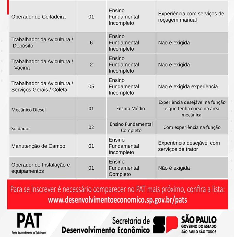 Maiores informações podem ser obtidas no Posto de Atendimento ao Trabalhador de Bastos, que atende na sala 4 do Poupatempo de Bastos, na Rua Campos Sales, 178, centro, ou pelos telefones (14) 99610-9766 e (14) 99745-3532. O interessado deve procurar à unidade de emprego munido de RG, CPF, Carteira de Trabalho e currículo atualizado.