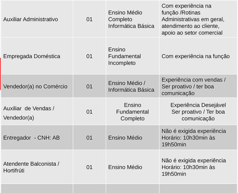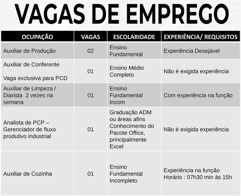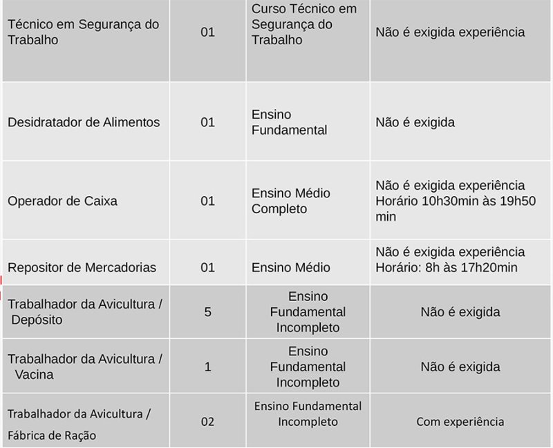 Das vagas disponíveis, 1 de auxiliar de conferente (vaga exclusiva para PCD), 1 de analista de PCP (gerenciador de fluxo produtivo industrial), 1 de entregador (CNH:AB, horário: 10h30 às 19h50), 1 de atendente balconista/hortifrúti (horário: 10h30 às 19h50), 1 de técnico em segurança do trabalho, 1 de desidratador de alimentos, 1 de operador de caixa (horário: 10h30 às 19h50), 1 de repositor de mercadorias (horário: 8h às 17h20), 5 de trabalhadores da avicultura (depósito), 1 de trabalhador da avicultura (vacina), 5 de trabalhadores da avicultura (coleta/serviços gerais) e 1 de operador de instalação e equipamentos, não exigem experiência do candidato.