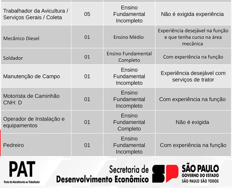 Maiores informações podem ser obtidas no Posto de Atendimento ao Trabalhador de Bastos, que atende na sala 4 do Poupatempo de Bastos, na Rua Campos Sales, 178, centro, ou pelos telefones (14) 99610-9766 e (14) 99745-3532. O interessado deve procurar à unidade de emprego munido de RG, CPF, Carteira de Trabalho e currículo atualizado.