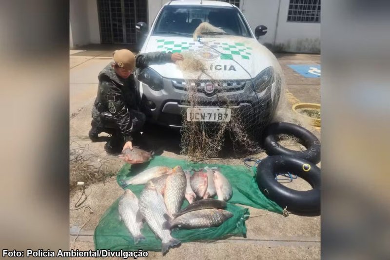 Um dos envolvidos foi detido no local. O outro suspeito foi identificado após os policiais localizarem documentos pessoais em um rancho às margens do rio. No total, foram apreendidos 32 quilos de peixes das espécies curimbatá e piauçu, além de uma tarrafa, 10 redes de nylon e duas boias.