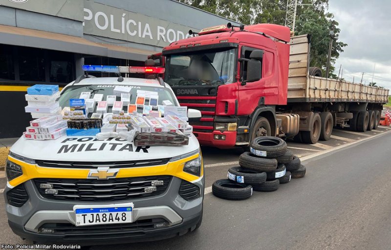 A Polícia Militar Rodoviária prendeu um motorista de uma carreta por contrabando/descaminho após localizar, no veículo de carga que conduzia, vários celulares, produtos eletrônicos em geral, pneus, cigarros e medicamentos para emagrecimento e anabolizantes, avaliados em quase R$ 300 mil. O flagrante aconteceu por volta das 12h45 de quarta-feira, dia 11,no quilômetro 474 da Rodovia Assis Chateaubriand (SP-425), município de Pirapozinho (SP).