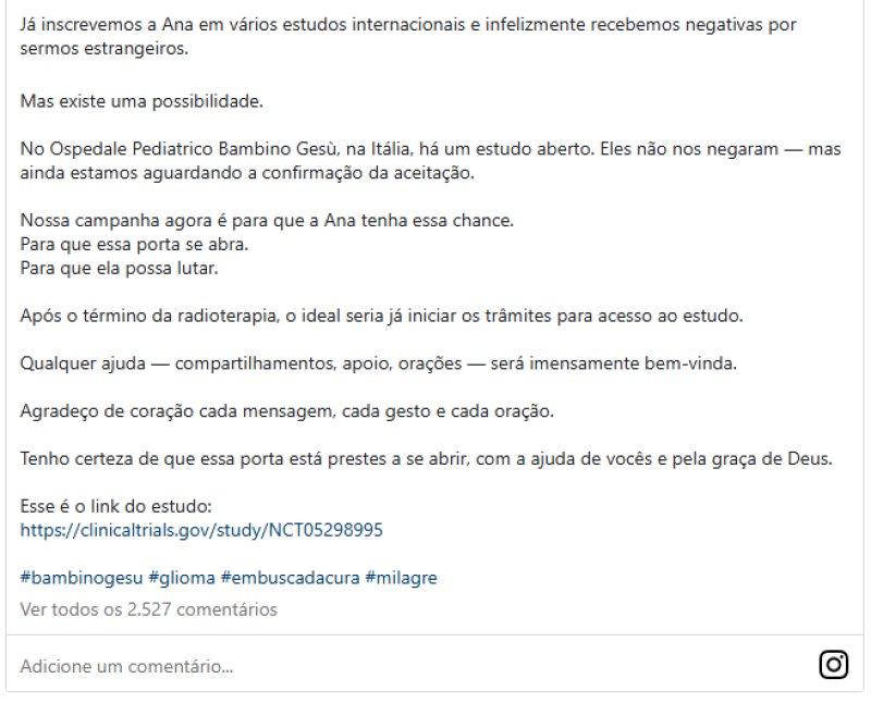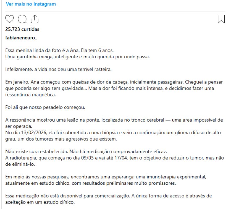 "Como uma pessoa que tem fé, eu creio na cura. Se a cura não vier, creio que o tempo de vida dela possa ser maior do que um ano, maior que dois anos, para que ela consiga esperar que novas terapias que estão em estudo possam curá-la", finaliza.