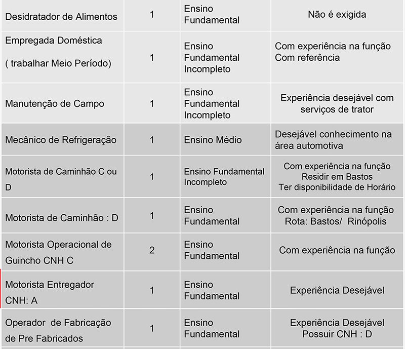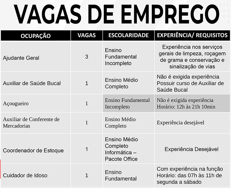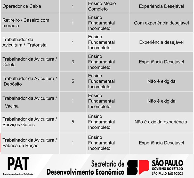 Das vagas disponíveis, 1 de auxiliar de saúde bucal (possuir cursos de auxiliar de saúde bucal), 1 de açougueiro (horário: 12h às 21h10), 1 de desidratador de alimentos, 5 de trabalhador da avicultura (depósito), 1 de trabalhador da avicultura (vacina) e 5 de trabalhador da avicultura (serviços gerais), não exigem experiência do candidato.