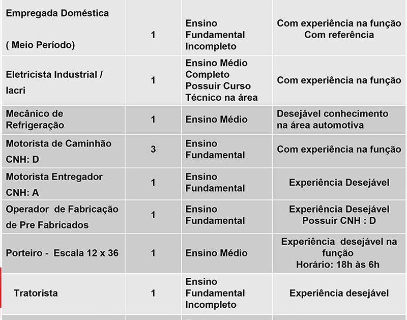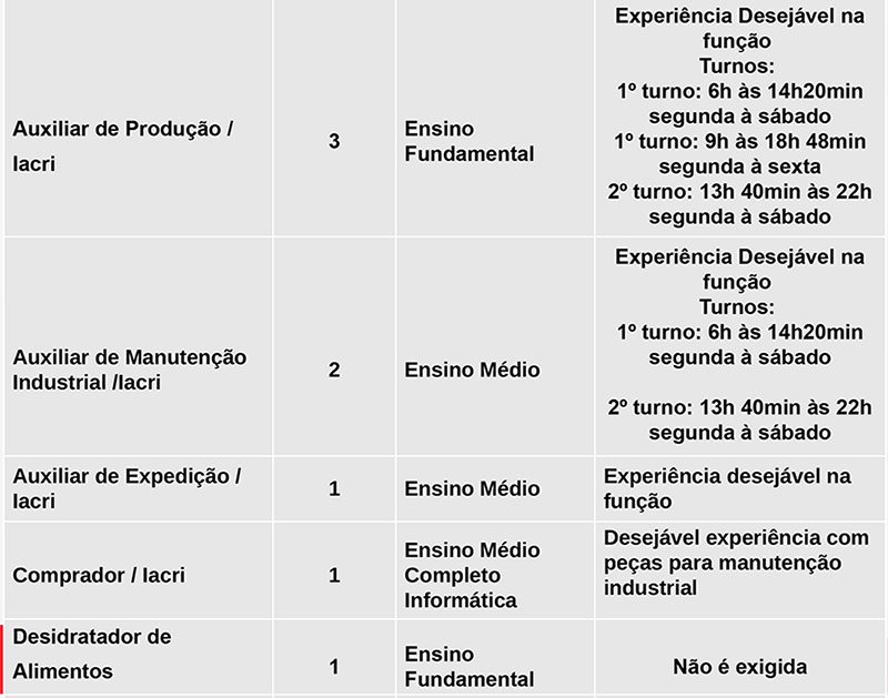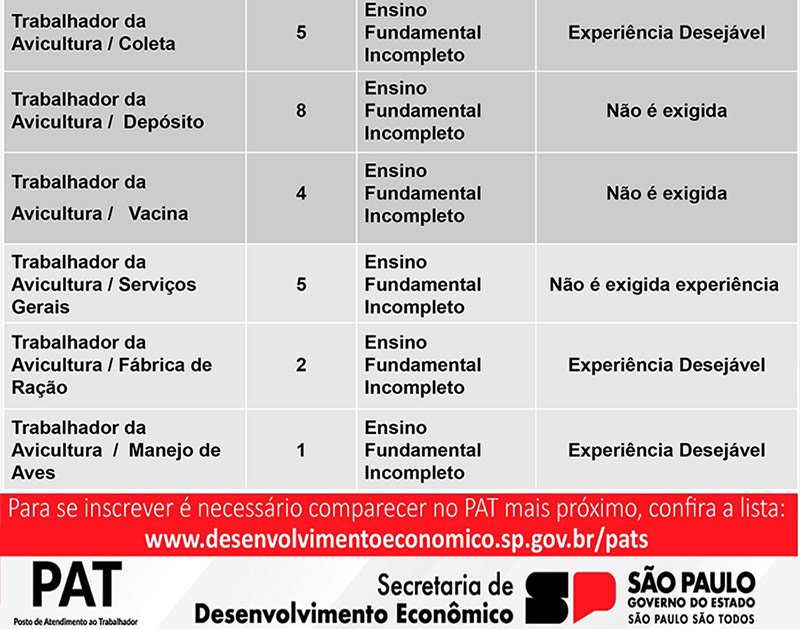 Das vagas disponíveis, 1 de auxiliar odontológico (possuir cursos de auxiliar de saúde bucal), 1 de desidratador de alimentos, 8 de trabalhador da avicultura (depósito), 4 de trabalhador da avicultura (vacina) e 5 de trabalhador da avicultura (serviços gerais), não exigem experiência do candidato.