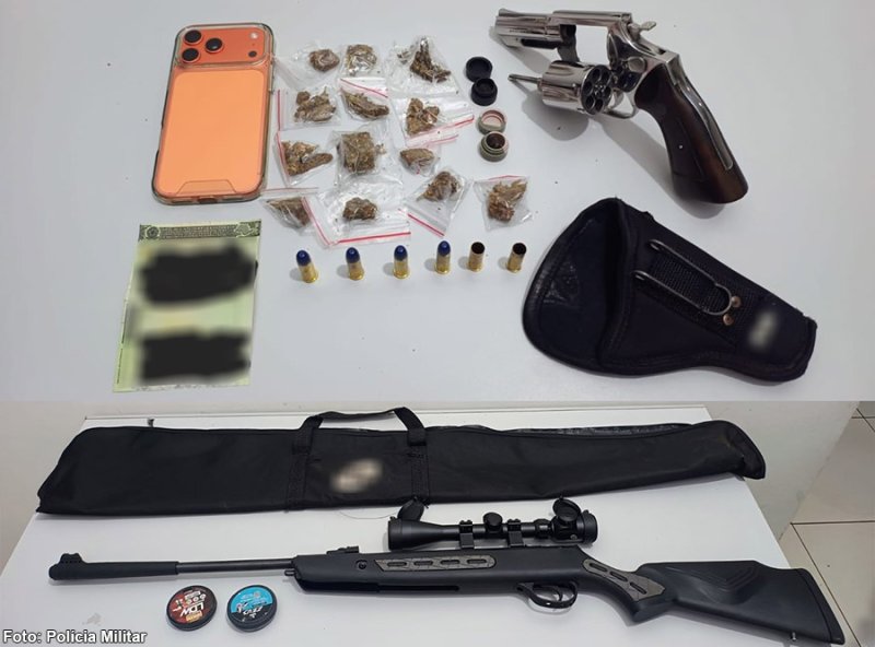 Ainda conforme a PM, após a equipe prosseguir com as busca veicular e localizar sobre o banco do carona o revólver calibre 38, carregado com quatro munições intactas e duas deflagradas, e uma carabina de pressão, juntamente com dois recipientes contendo chumbinhos, que estava no porta-malas do carro, o indivíduo foi indagado e informou que está sendo ameaçado pelo atual companheiro de sua ex-namorada, com a qual tem um filho, e que a arma de fogo era para a sua defesa e sobre o entorpecente declarou que estava levando para amigos em uma conveniência.