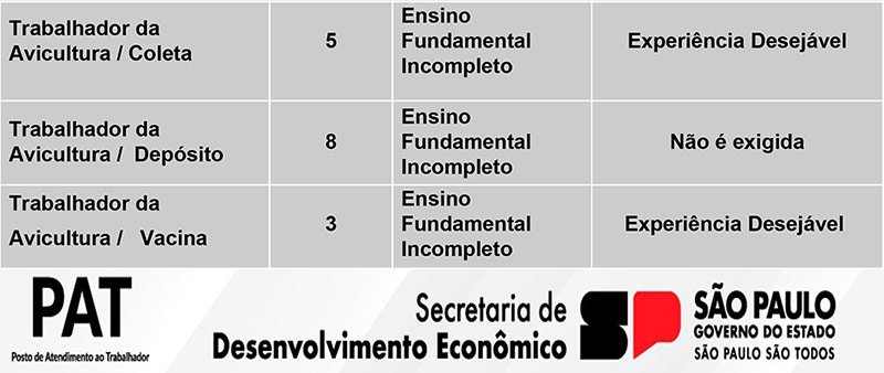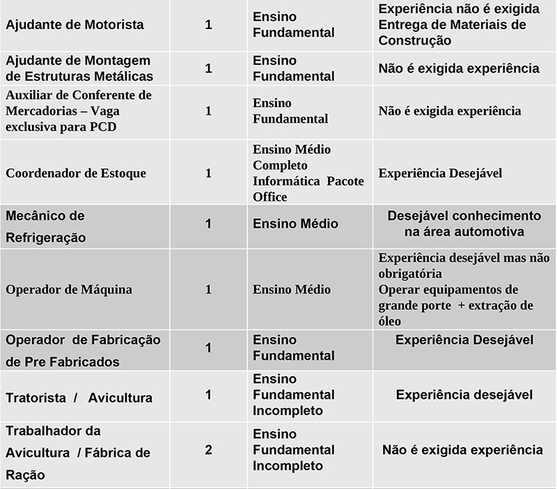 Das vagas disponíveis, 3 de auxiliar de produção/ensacamento de grãos (Iacri), 4 de auxiliar de carga e descarga (Iacri), 1 de ajudante de motorista (entrega de materiais de construção), 1 de ajudante de montagem de estruturas metálicas, 1 de auxiliar de conferente de mercadorias (vaga exclusiva para PCD), 1 de operador de máquina (experiência desejável mas não obrigatória, operar equipamento de grande porte e extração de óleo), 2 de trabalhador da avicultura (fábrica de ração) e 8 de trabalhador da avicultura (depósito), não exigem experiência do candidato.