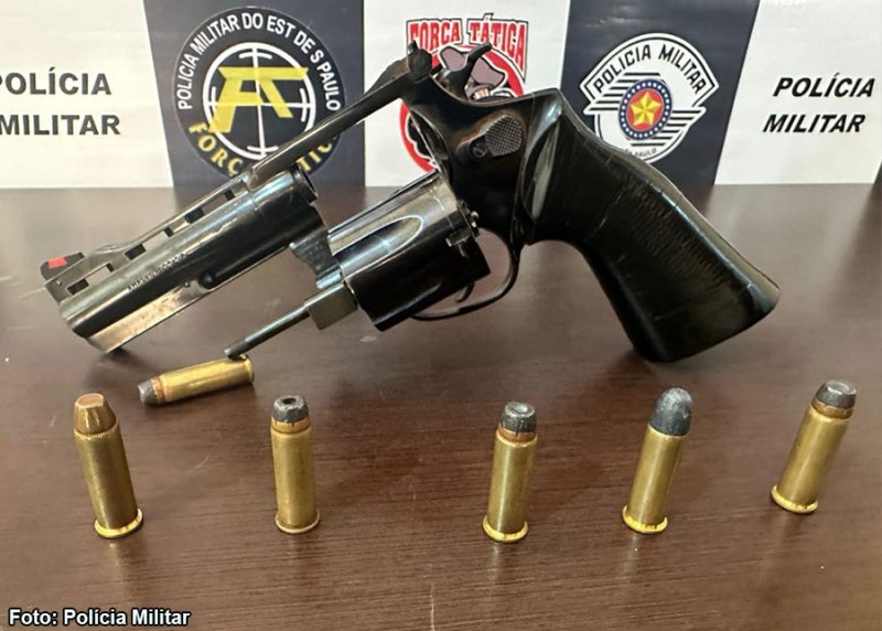 A PM acrescenta que o indivíduo, ao perceber a presença da equipe, demonstrou nervosismo, entregou a arma ao proprietário da residência e evadiu-se correndo para os fundos do imóvel. Os policiais desembarcaram e, após fazeremo cerco tático da residência, dois agentes deslocaram-se para os fundos (terreno vazio) e os outros dois realizaram a incursão pelo interior do imóvel, localizando. um revólver de 4 polegadas refrigerado e municiado com seis cartuchos íntegros.