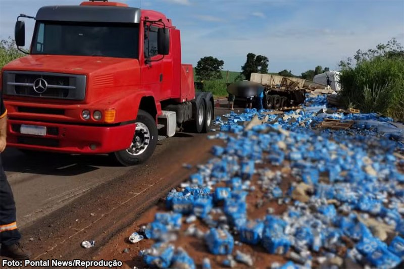 Uma carga de cerveja transportava por uma carreta caiu e interditou um trecho da Rodovia Euclides de Oliveira Figueiredo (SP-563), em Mirante do Paranapanema (SP), nesta quinta-feira (16).